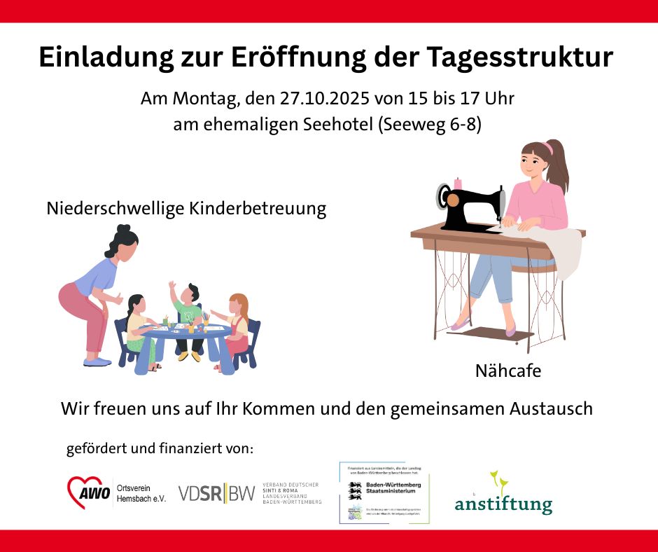 Am 27. Oktober wird das AWO Nähcafe in Kooperation mit dem Verband der Sinti und Roma Baden Württemberg (VDSR BW) in der Flüchtlingsunterkunft im ehemaligen Seehotel eröffnet. Ziel ist der Aufbau einer Tagesstruktur für die BewohnerInnen. Außerdem soll die Hemsbacher Bürgerschaft die Möglichkeit erhalten, die Nähmaschinen für eigene Nähprojekte zu nutzen. Die Öffnungszeiten des AWO Nähcafe’s werden über die Medien bekannt gegeben.